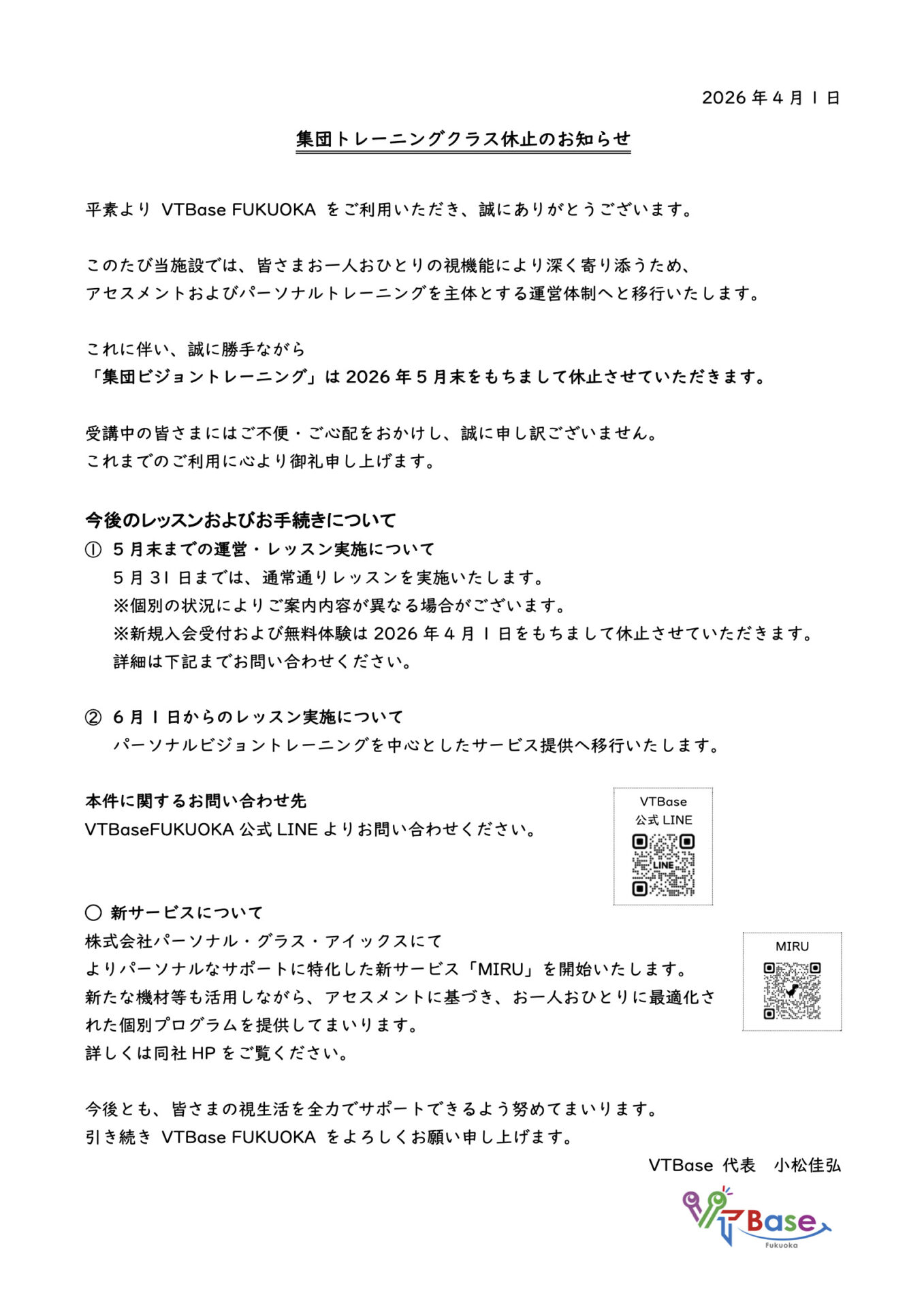 集団ビジョントレーニング」は 2026 年 5 月末をもちまして休止させていただきます。